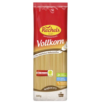 Vollkorn Spaghetti N°5 von Recheis sind die ideale Wahl für alle, die gesunde und schmackhafte Pasta lieben. Diese Nudeln bestehen aus 100 % Vollkornhartweizengrieß und sind damit reich an natürlichen Ballaststoffen, die nicht nur sättigen, sondern auch die Verdauung unterstützen. Wenn du auf der Suche nach einer gesunden Alternative zu herkömmlicher Pasta bist, liegt mit diesen Vollkorn Spaghetti genau richtig.